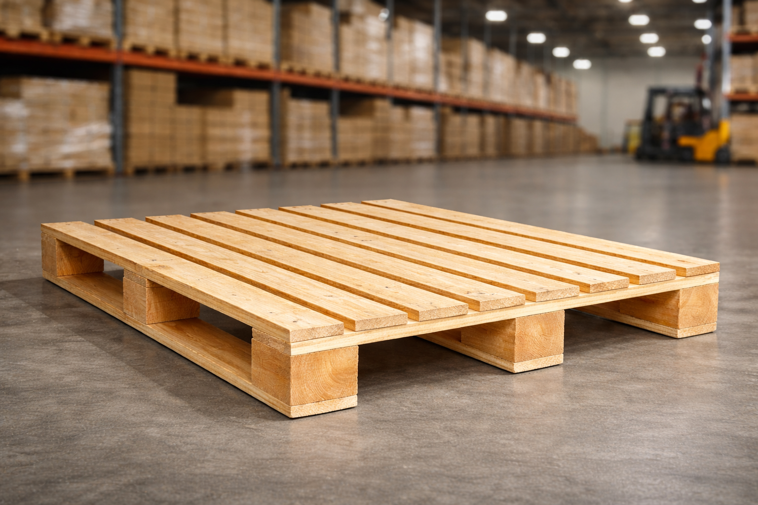 O palete face simples, também conhecido como palete de uma face, possui apenas uma superfície superior para apoio da carga, com estrutura inferior de sustentação.